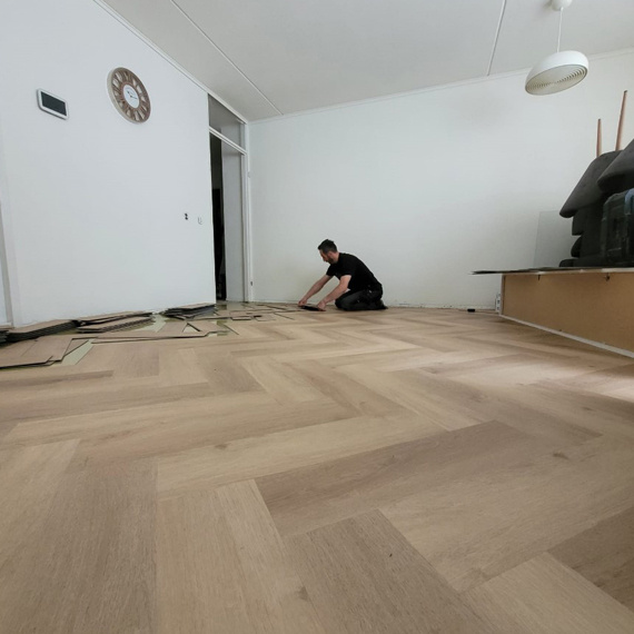 De vloer is mooi gelegd, hele vriendelijke man. Werkt heel hard.